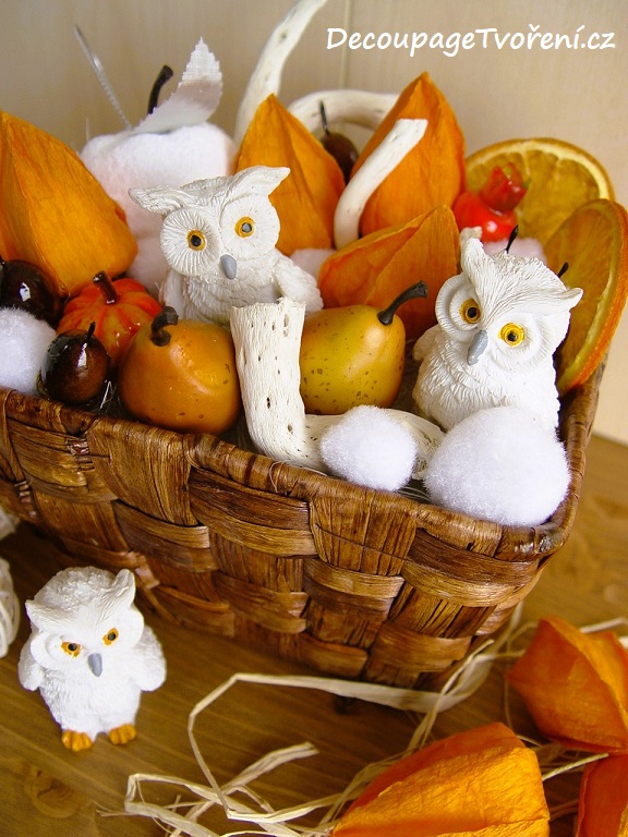 Drobné bílé sovy jsou nezbytností celé dekorace. Vyjadřují emoce, kdy se podzim chýlí ke konci a nastupují první chladné dny zimy. Inspirace a Photo By Lucie B.