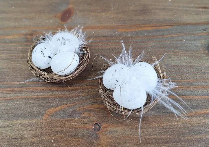 Materiál: traviny, kůra (hnízdo), umělá hmota (vejce), bílé peří.