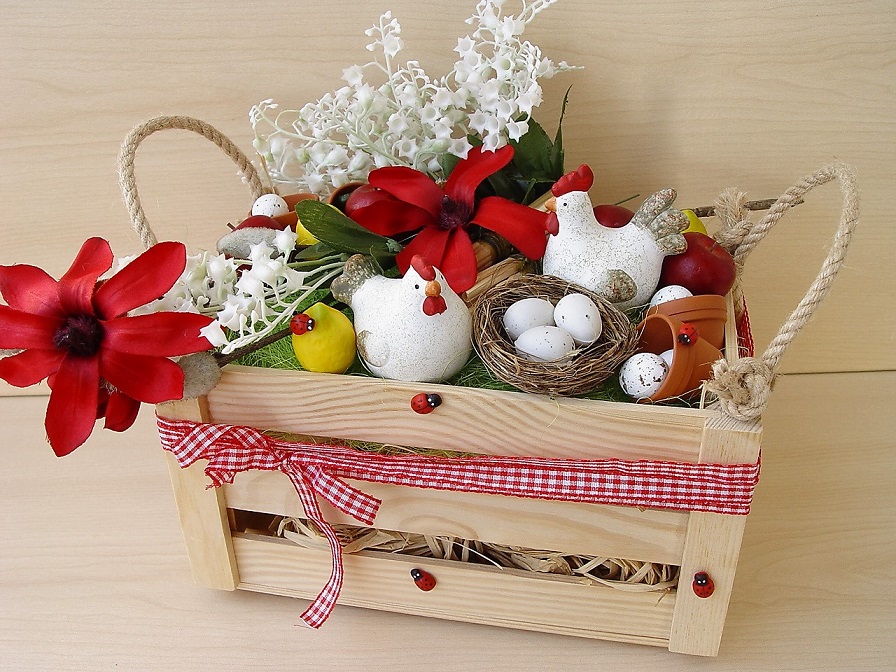 Co potřebujete: 1 ks dřevěná líska 24,5x14,5x12,5 cm + 2 ks provázků (každý o min. délce 35 cm a min. Ø 0,5 cm), 1 ks kohoutek a slepička pr.4,5 cm, 1 ks hnízdo vajíček, 1 bal. hnízdo se 3-mi vajíčky, 1 bal. hnízdo s bílými vajíčky, 4 ks červených jablíček, 4 ks mini květináčků Ø 3,5 cm; 5 až 7 ks berušek, 3 ks žlutých citronů, 4 ks stonek konvalinka, 1 ks větvičky magnolie/červená, 2 snopy obilí, 2 m stuhy kostka červeno-bílá. 25 g světle zelený sisal, 5 ks rafie nebo 1 ks aranžovací hmota + 2 ks rafie (viz. Tip**).