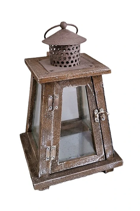 Nádherná lucerna z dřevěného materiálu s kovovou stříškou a kováním, se sklem okolo, udělá radost všem příznivcům starobylého vzhledu. Lucerna má otevírací dvířka se stříbrným kováním pro umístění svíčky, elektrického světýlka nebo jiné dekorace.