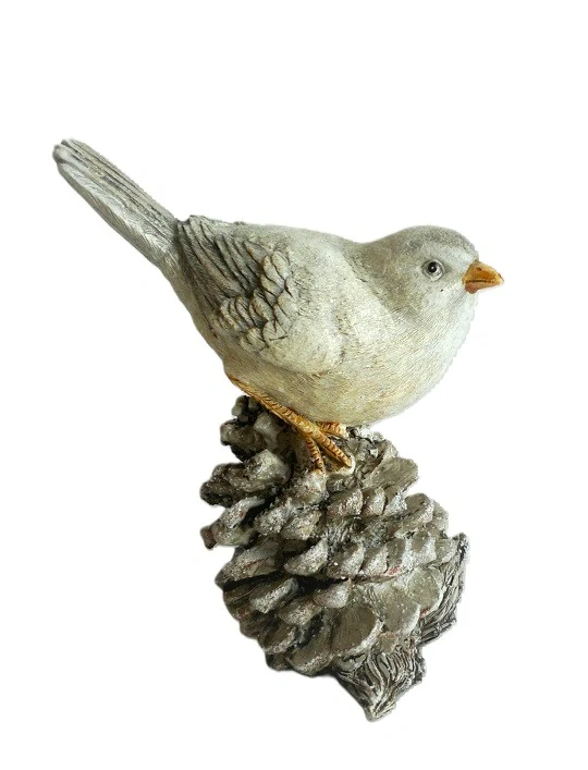 Mrazivé ráno a pohled z okna: ptáček sedící na šišce, která je na povrchu "mrazivá/zasněžená". Povrch je pokryt třpytivými stříbrnými třpytkami na šišce i ptáčkovi a vytváří tak dojem mrazivého okamžiku. Pokud tuhle dekoraci přidáte mezi sušené borovicové šišky s květy bílé čemeřice, můžete se těšit z mrazivého dne v pohodlí svého domova.
