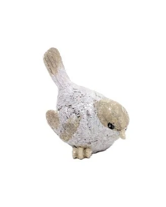 Ptáček v zimním designu, v bílo-hnědé se třpytkami, které odráží světlo. Tenhle ptáček se hodí pro dekorace věnců a truhlíků.