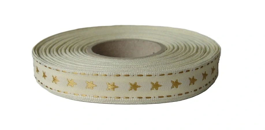 Stuha s výšivkou uprostřed s motivem hvězdy, okraj lemován zlatou nití. Stuha díky své barvě bude tou poslední třešničkou na dortu při balení dárků, ať vánočních nebo narozeninových.