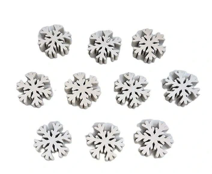 Vločky s ozdobným vzorem, vyřezávané ze dřeva s bílým povrchem.