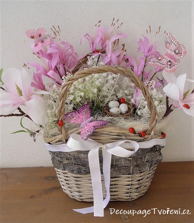 Proutěný koš plný jarních květin magnólie, konvelinek a denivek. Aranžmá ožije motýli a beruškami. Inspirace a Photo By Lucie B.