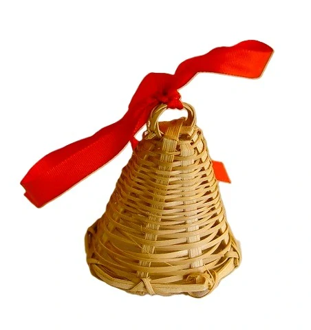 Jednoduchý zvoneksplétaný z drobných šénů slámy s červenou mašlí.