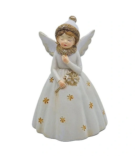 Sváteční Vintage figurka víla vánoční s bílým kabátem a vločkami. Na bílé sukni a kabátku jsou zlaté vločky, okraje kulichu ve zlaté. V ruce drží andělka velkou vločku.