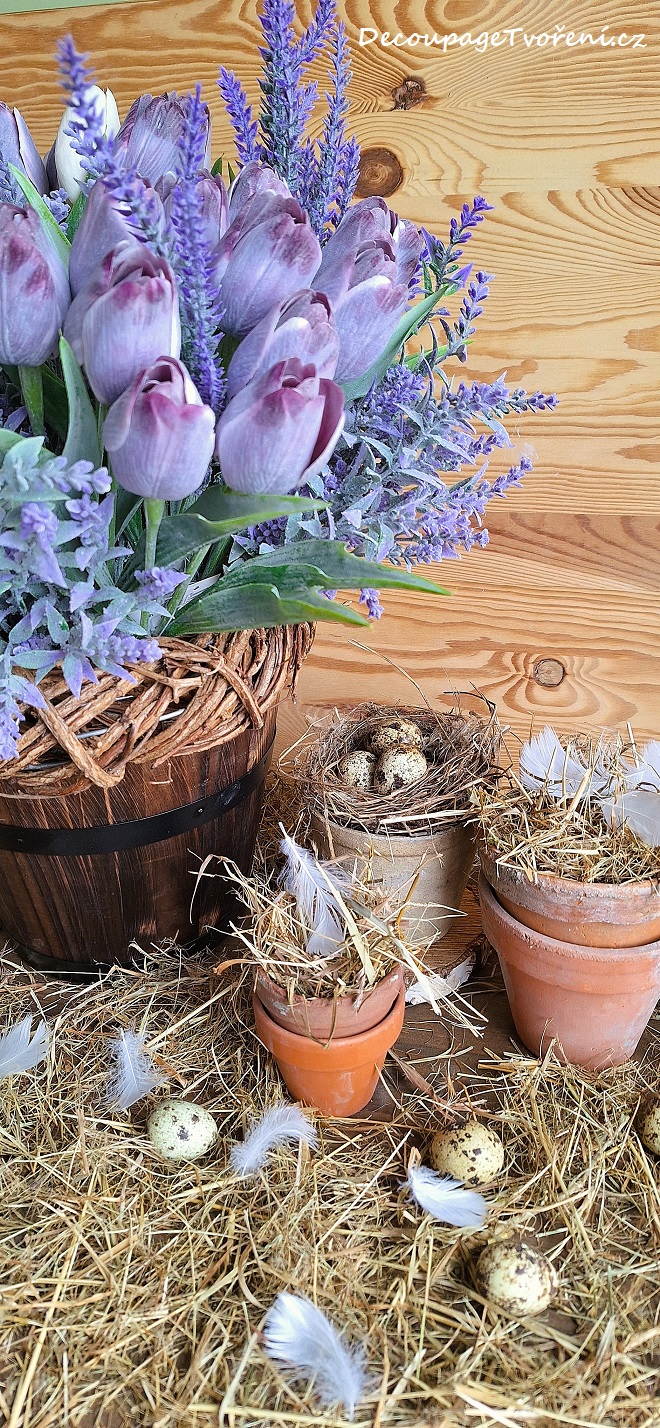 Rustikální vzhled s levandulovými prvky s jarním nádechem? Dřevěné vědro s věncem ze silného proutí, vyplněné květy bílé a fialové - tulipány, vřesovce a levandule. Domeček s levandulovým motivem a staré hliněné květináče s hnízdy plná křepelčích vajec. Výzdoba, která se k jaru hodí. Inspirace a Photo By Lucie B.