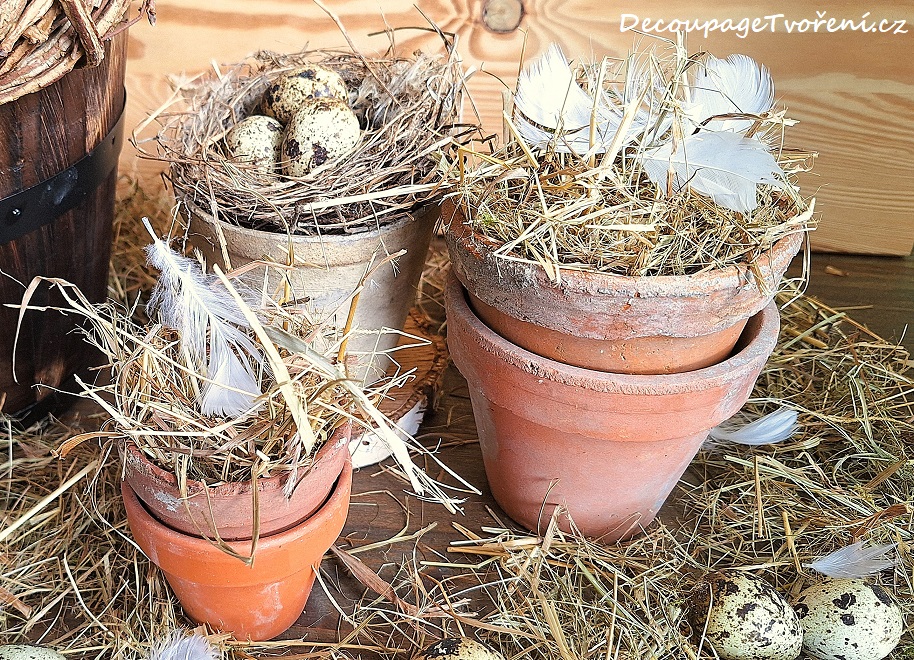 Připomíná vám to rustikální styl? Nemýlíte se. Ve výzdobě v rustikálním stylu by neměla chybět přírodní vejce - křepelčí jsou ideální a ostatní materiál, který je v dekoru přirozeného opotřebovaného vzhledu - staré hliněné květníky vyplněné sušeným senem s bílými peříčky. Inspirace a Photo By Lucie B.