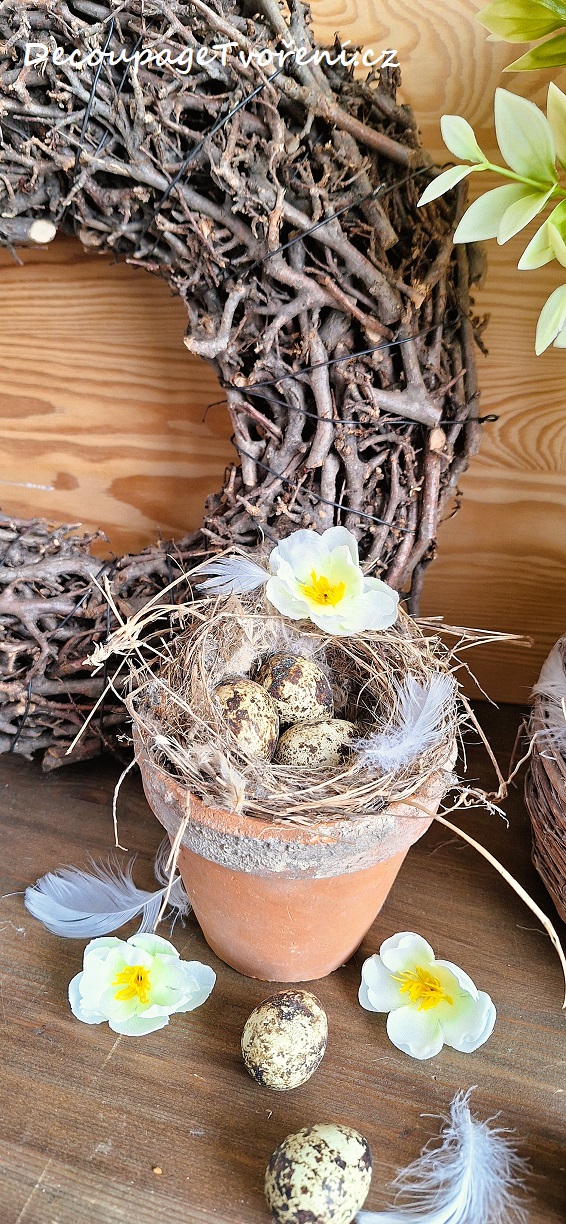Křepelčí vejce nejsou jen tak obyčejná vejce. Tahle jsou přírodní - zbarvené skořápky bez obsahu uvnitř. V kombinaci s oprýskaným starším květníkem, nádherně vyniknou. Jarní cibuloviny narcisů a dřeviny v přírodním hnízdě, které vypadá jako velké ptačí hnízdo. Nechte se okouzlit jarní atmosférou. Inspirace a Photo By Lucie B.