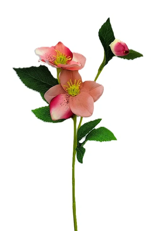 Čemeřice v jemném odstínu od světlé k tmavě růžové a bílé na okvětních lístcích, doplněné výraznými tečkami. Pestíky ve žluté. Květy jsou v matné. A protože je květina umělá, tuto zimní krásu si uchovejte ve svém obydlí a dlouho se z ní můžete těšit!
