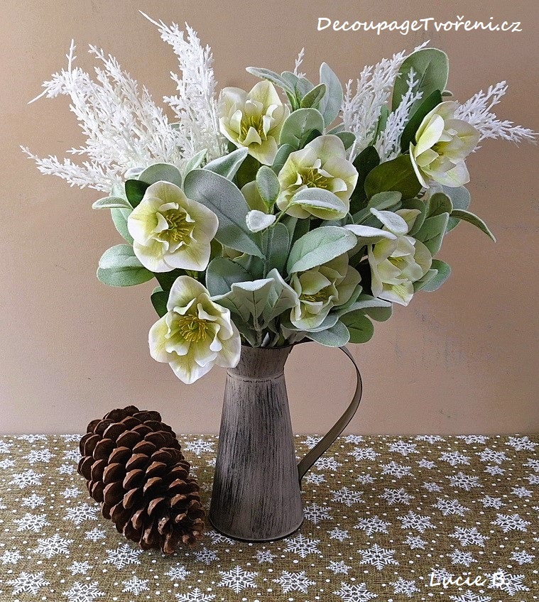 Čemeřice v plechovém džbánu doplněná ojíněnými listy šalvěje a bílými mrazivými větvičkami cypřiše. Džbán si dejte na stůl nebo oblíbené místo, ať vám dělá aranžmá radost. Velká šiška už je jen nezbytným doplňkem zimního aranžmá. Photo By Lucie B., DecoupageTvoření.cz