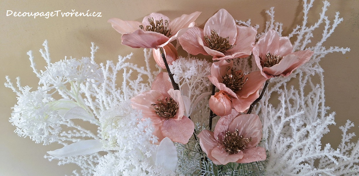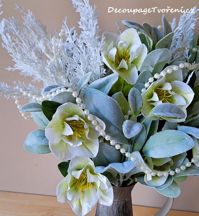 Růžovým květům čemeřice dělá společnost mrazivá bílá větvička a květy kaliny s listy. V jednoduchosti je krása. Photo By Lucie B., DecoupageTvoření.cz