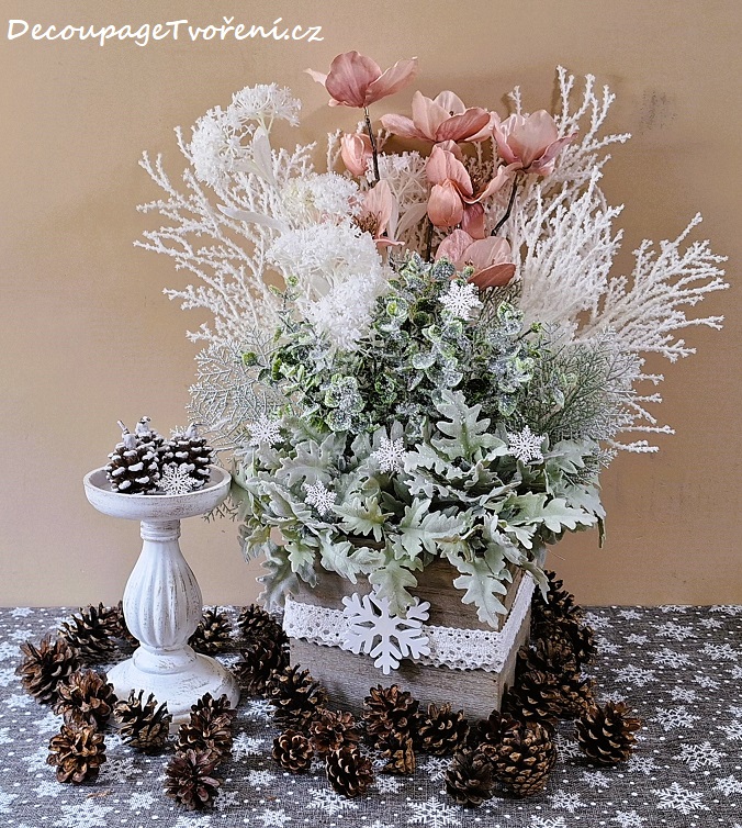 Když chcete, aby bylo aranžmá velmi mrazivé? Květy růžové čemeřice aranžujte do dřevěného truhlíku se spousty mrazivé a zasněžené zeleně. Šišky jen volně rozsypejte okolo. Překvapte ostatní, když malé šišky v podstavci na svíčky zapálíte. Jsou to opravdové designové svíčky! Photo By Lucie B., DecoupageTvoření.cz