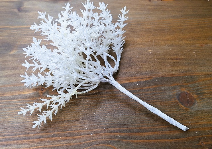 Svazek 10 ks větviček s délkou 19 cm v bílé barvě se stříbrnými třpytkami. Každou můžete použít zvlášť. Na větvičce je 1 výhon listí.