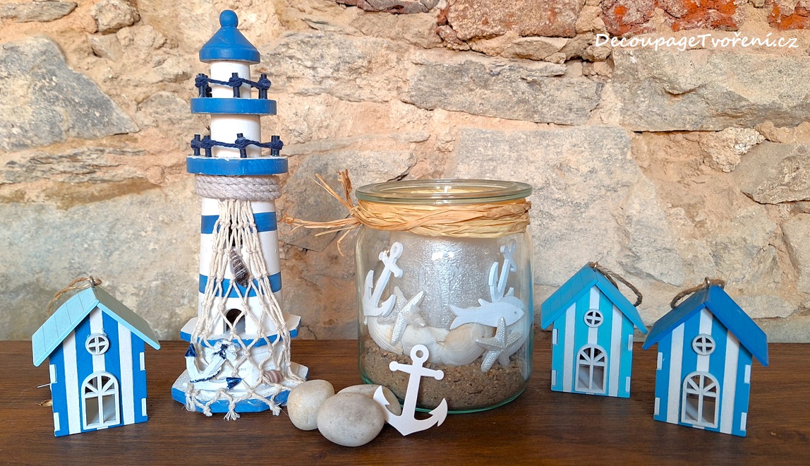 Vzpomínky na středomořskou atmosféru si můžete vytvořit doma, na chalupě, terase, balkónu a zahradě. Bílo-modré pruhy na domečkách, majáku nebo rybky a plachetnice, skvěle navodí pohodu jako u moře. Inspirace a Photo by Lucie B.