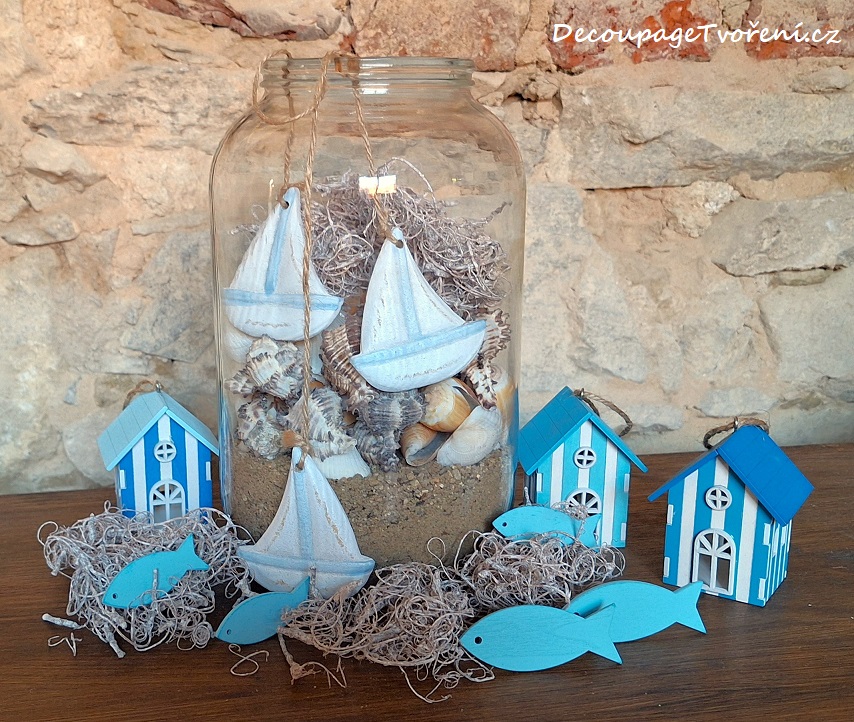 Nejkrásnější zbarvené mušle, přírodní, které si vyberete u nás. Hvězdice, které jsou umělé, můžete do dekorací přidat také. Stylové malé ozdoby - rybky, kotva, kormidlo, které dodají aranžmá charakter. Rybářská síť, s kterou všechno stylově dozdobíte.