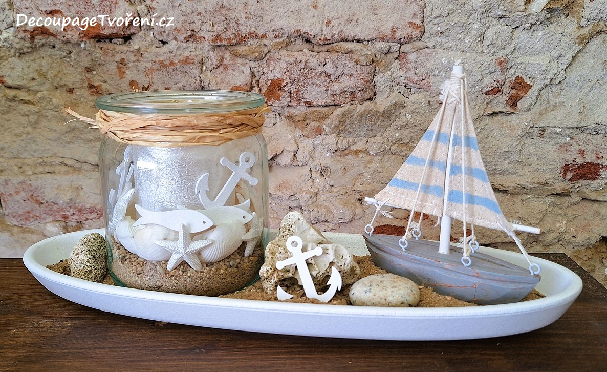 Ke středomořskému zátiší využijte bílý podnos vysypaný pískem. Umístěte plachetnice, rybky, lastury. Skleněný svícen pro perlově stříbrnou svíčku vytvoříte ze skleněné vázy. Inspirace a Photo by Lucie B.