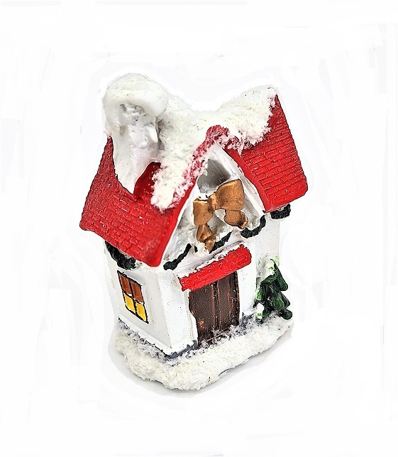 Domeček má zasněženou střechu a zem okolo, je ručně malovaný.