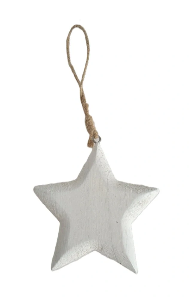 Hvězda je ze dřeva v bílé barvě. Je zavěšena na provázku z juty.
