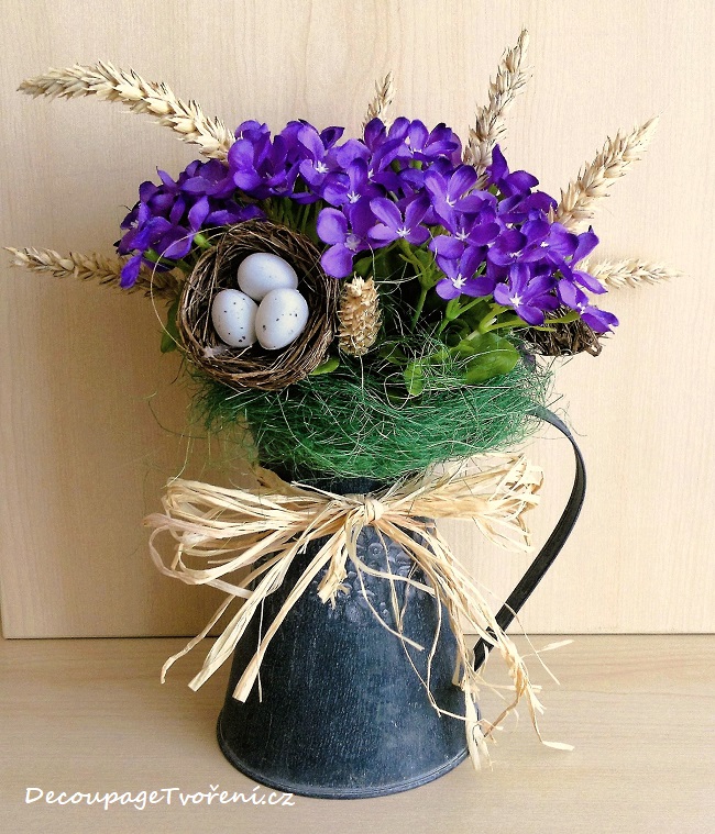 Do kovového džbánu jsem potřebovala:2 svazky lesních fialek, 1 svazek konvalinek, 1 větvičku s květy a pupeny magnolie, hnízdo a několik žlutých kuřátek. Okolo džbánku omotejte přírodní rafii a svažte na mašli. Na okraji džbánku jsem umístila zelený sisal, abych podpořila bohatost umístěných svazků květin. Hnízdo s kuřátky jsem přilepila na špejli a vložila mezi stonky.