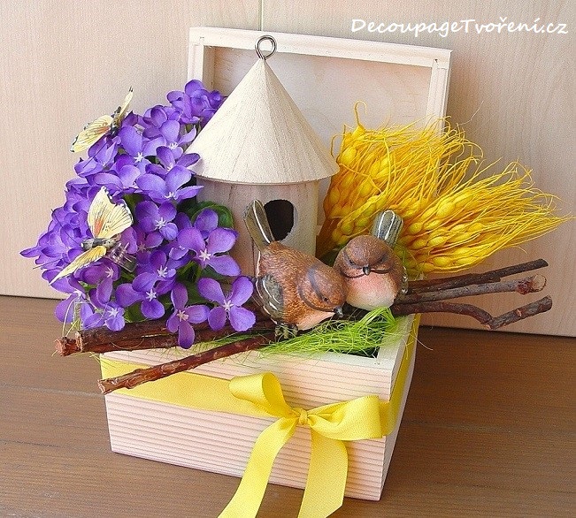 Dřevěnou krabičku dočasně vyplňte jarní dekorací: lesními fialkami, ptačí budkou s ptáčky, umělým obilím a motýly. Až bude po jarním období, krabičku zase použijete na sáčky s čajem nebo bonbóny. Inspirace a Photo by Lucie B.