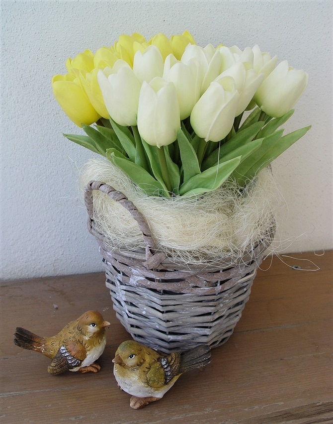 Proutěný košíky a nádoby jsou oblíbené pro "sázení" květin. Do tohoto košíku se hodily tulipány a ptáčky s mini květníky. Inspirace a Photo by Luciana