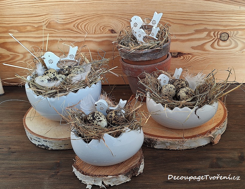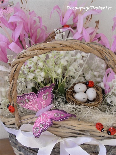 Kulatina z břízy jako dekorační prvek pro skořápky z porcelánu, vyplněné sušenou trávou senem inspirované ptačím hnízdem. Koš s konvalinkou, kdy základ povrchu je zakryt bílým sisalem, který ladí s květy konvalinek a dává vyniknout motýlu a beruškám. Inspirace a Photo by Luciana