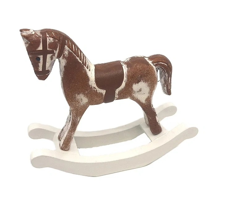 Dřevěný houpací koník v hnědém odstínu s bílým podkladem, který patří (nejen) ke svátečnímu období, ale také k zimnímu chladnému období. Koník se hodí jako ozdoba ke stromku nebo na svátečně prostřený stůl, stejně tak na parapet okna po Adventním a Vánočním období, kdy měníme dekorace za zimní.
