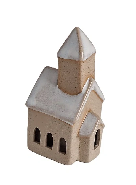 Malý kostelík, klasický, jednoduchý z keramiky s drsnými stěnami. Střecha glazovaná bílá s leskem.