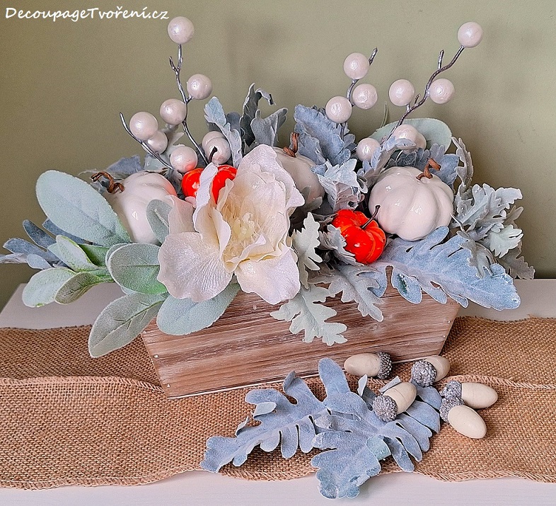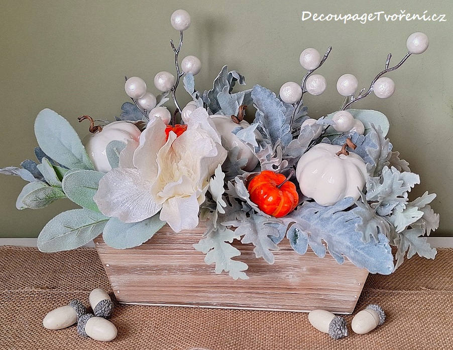 Pokud truhlík umístítě na stůl, nechte několik "spadaných" listů dubu a bílých žaludů u truhlíku. Takhle vytvoříte atmosféru "když padá listí a plody" jako v přírodě.