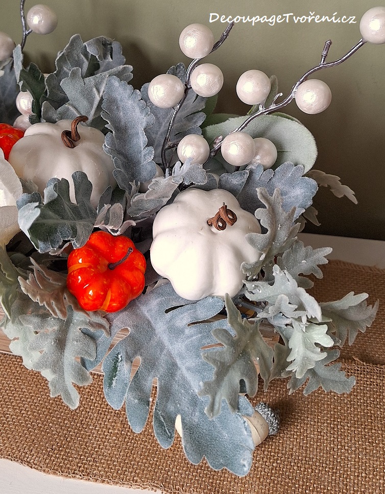 Když se inspirujete přírodou, zjistíte, že v tuhle roční dobu se hojně vyskytují různé větvičky s bobulemi. Stonek s bobulemi v odstínu bílá perleť má své místo mezi zelení a dýněmi.