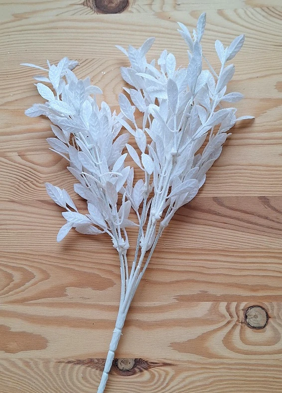 Větvička listnatce 34 cm s listy. Obsahuje 5 výhonů, které se dají samostatně použít. Na listech jsou stříbrné třpytky imitující čerstvě napadaný sníh.