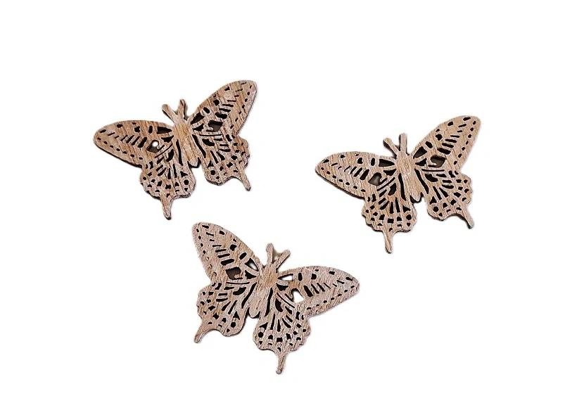 Motýli, vyřezávané drobné přízdoby ze dřeva, v přírodním odstínu. Když je použijete v přírodním odstínu, elegantně vyniknou v dekoraci se sušenými rostlinami a plody, s umělými květinami ve džbánu nebo na proutěném koši. Použít se dají k výzdobě přání, jmenovek nebo originálního rukopisu, když máte v plánu vytvořit originální dárek.
