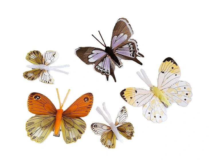 Barevní motýli na klipu z peří jsou nádhernou dekorací do vašeho obydlí. Jejich barevnost vás pohladí po duši. Protože mají kovový klip, snadno je připnete na záclony, lampičku nebo na provázek nástěnky se vzkazy.
