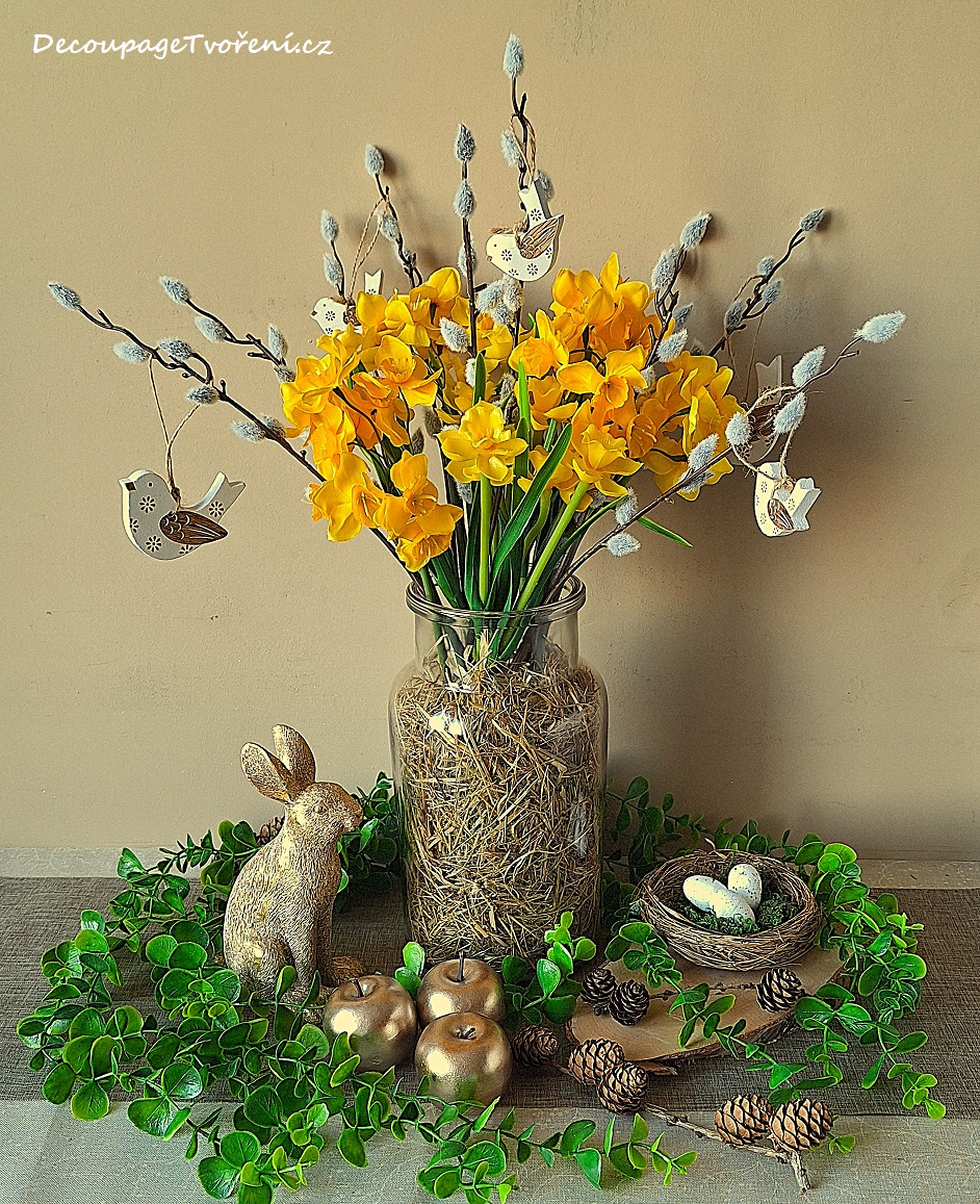 „Zlatá barva je letošním trendem. Přidejte žluté narcisy a vrbové větvičky s pupeny. Umělé květiny a dřeviny jsou k nerozeznání od těch řezaných.“
