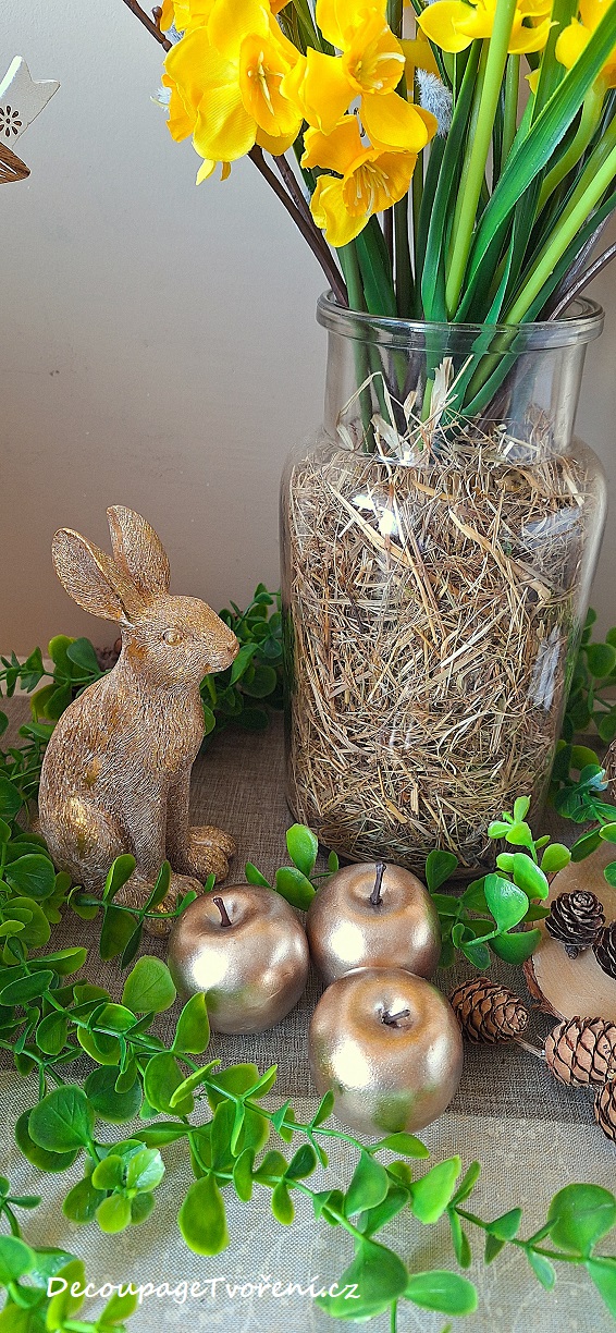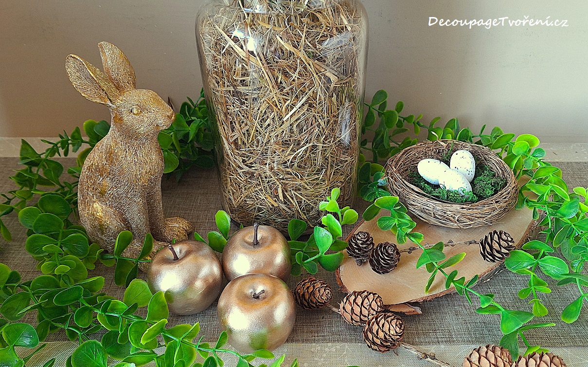 Zlatí zajíci jsou letos hitem! K tomu přidejte zlatá jablka, hnízdo s vajíčky, sušené šišky modřínu na větvičce a "zazeleňte" převislým eukalyptem. Inspirace a Photo by Luciana