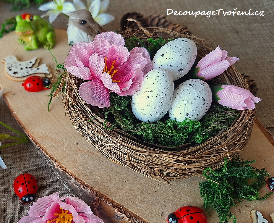 Hnízdo z jemných stébel sušené trávy, vyplněné přírodním mechem, s umělými vajíčky a květy dřeviny. Do lesa na mech nechoďte. Sušený mech zakoupíte ve skvělé kvalitě na e-shopu. Inspirace a Photo by Luciana