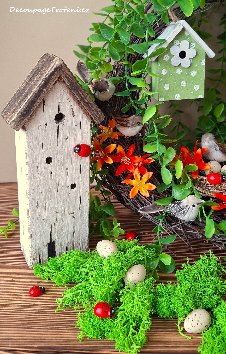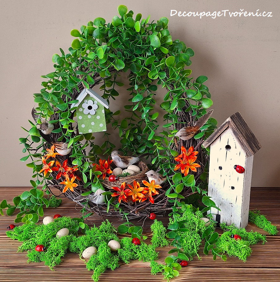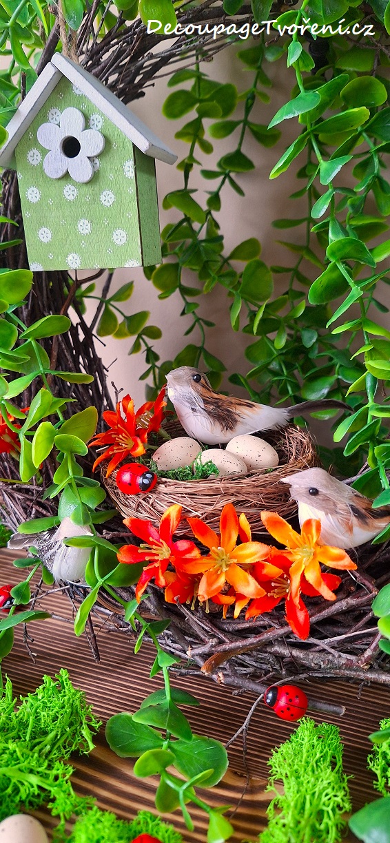 Věnec ze sušených větviček břízy obsadily barevní ptáčci. Několik květů jaterníku a zelené větvičky převislého eukalyptu s jarní budkou v zeleném odstínu vytvoří jarní atmosféru. Věnec se může zavěsit nebo umístit na poličku s dalším aranžmá: sobí mech a dřevěný přírodní domek. A berušky si nenechte ulétnout! Inspirace a Photo by Luciana