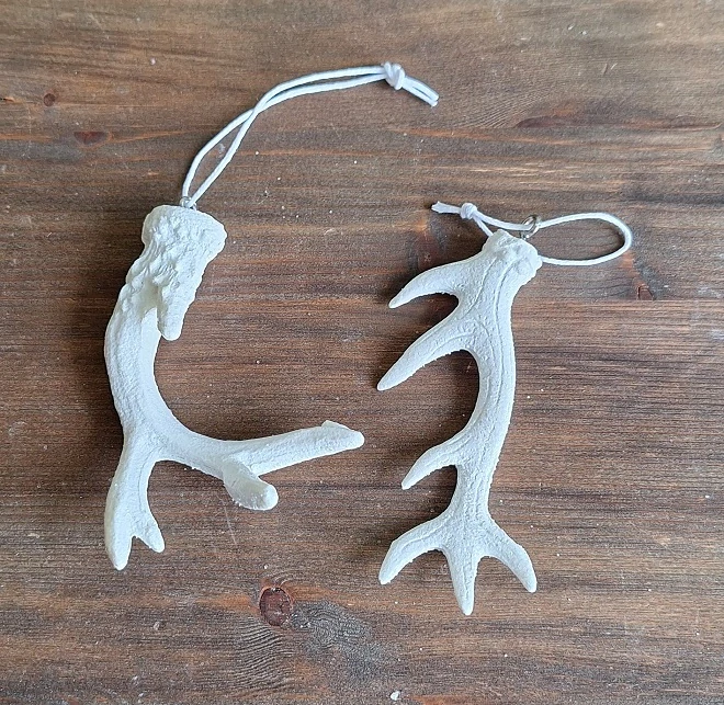 V páru 2 ks parůžků v odlišném designu. Každý má samostatně úchyt na zavěšení s gumičkou.