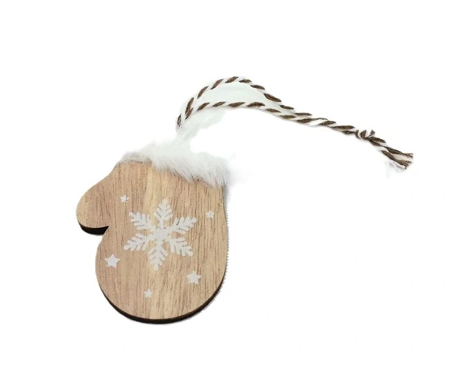 Rukavice je ze dřeva,s ručně malovanými detaily vločky a hvězd, s bílou kožešinkou a provázkem na zavěšení.