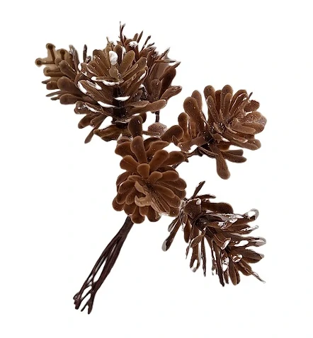 Umělé malé šišky borovice, se jemně zasněženým povrchem.