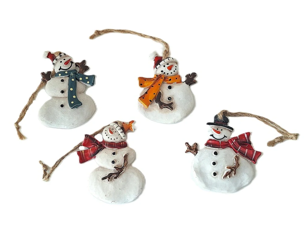 Tyto 4 druhy sněhuláků jsou na závěsu, proto je snadné je zavěsit na stromek, větvičky chvojí, na girlandu nebo větvičky z klacíků a nechat vyniknout jejich design. Každý se totiž tváří jinak, i když se všichni usmívají, své "ruce" tvořené větvičkami mají různě položené a ta šála! Ta jim vlaje pokaždé jinak, však je také nejvíce rozlišuje: každá šála má jiný design a barvu!
