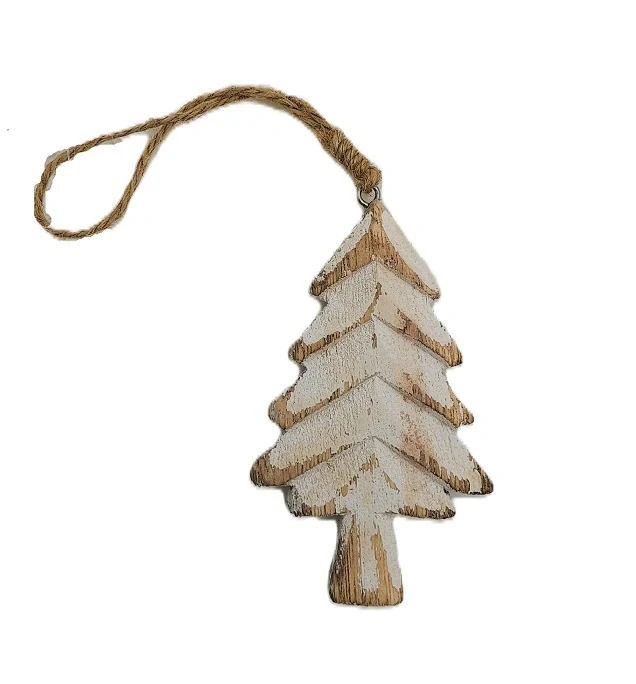 Stromek je ze dřeva a má 3D vzhled a povrch s bílou patinou. Je zavěšen na provázku z juty.