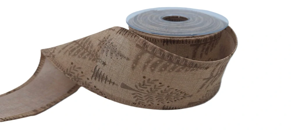 Podkladem je světle pastelový hnědý odstín, na kterém jsou vzorovány různé druhy a velikosti stromků v tmavším hnědém odstínu. Proto je tato stuha tak oblíbená nejen do jednoduchých aranžmá.