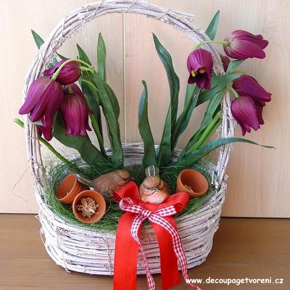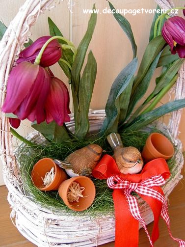 Proutěný košík se nejlépe "osází" tulipány a ptáčky s mini květníky. Třešničkou na dortu je stuha svázaná do mašle. Inspirace a Photo by Luciana