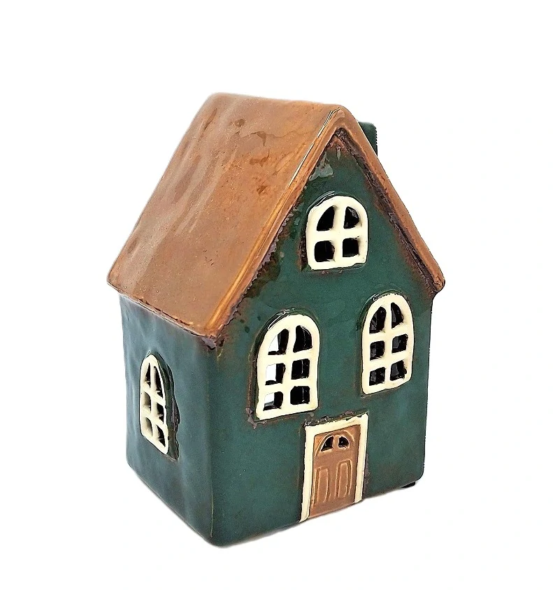 Keramický svícen je celý lesklý, neboť jeho povrch zdobí glazura. Krásný povrch stěn doplňují výrazné okenní rámy, vchodové dveře a střecha. Glazovaný povrch tvoří z domku designový kousek.