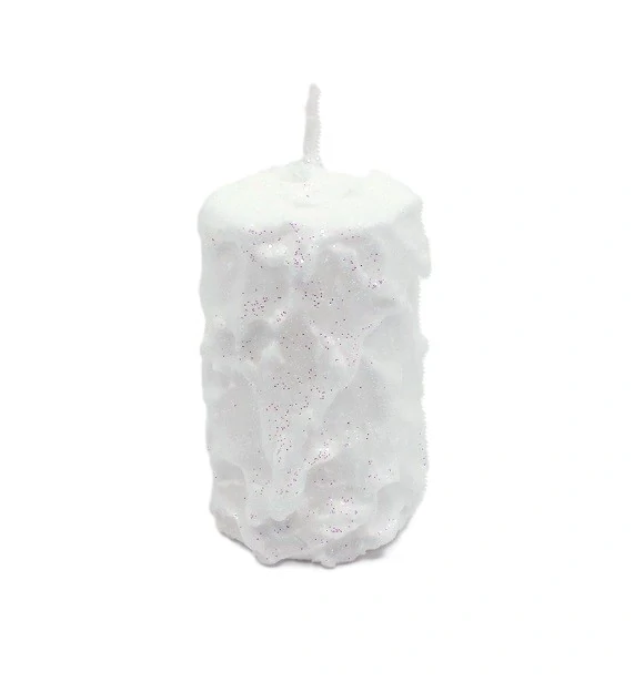 Bílá svíčka se zasněženým povrchem a stříbrnými třpytkami. Protože vosk nestéká z okraje dolů, stále tak můžete obdivovat její zasněžený povrch s třpytivými odlesky jako byste hleděli na sněhovou pláň.
