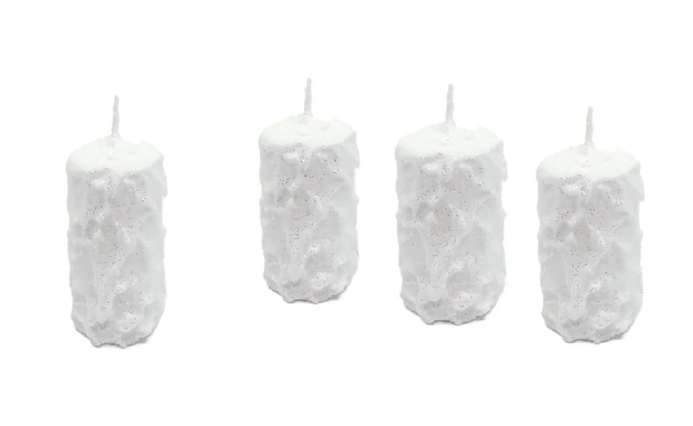 Bílá svíčka se zasněženým povrchem a stříbrnými třpytkami. Protože vosk nestéká z okraje dolů, stále tak můžete obdivovat její zasněžený povrch s třpytivými odlesky jako byste hleděli na sněhovou pláň.