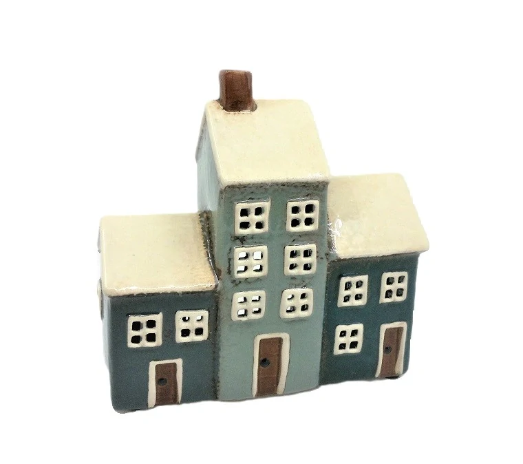 Keramický svícen je celý lesklý, neboť jeho povrch zdobí patina modro-šedá (latté) glazura. Krásný povrch stěn doplňují výrazné okenní rámy a střecha v patina bílém odstínu, hnědé vchodové dveře zvýrazňují celý domek. Glazovaný povrch tvoří z domku designový kousek!